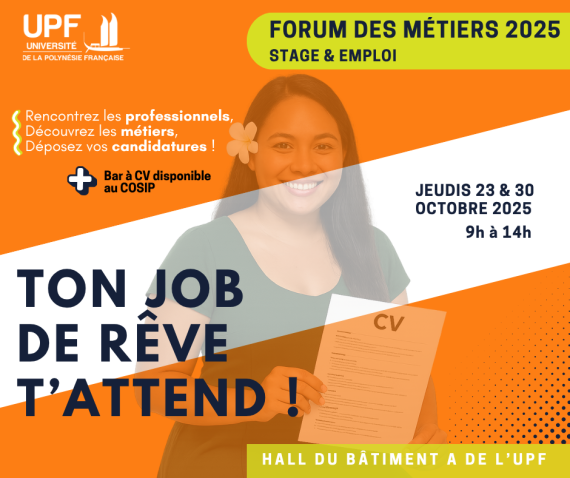 L'UPF organise son Forum des métiers les jeudi 23 et jeudi 30 octobre 2025, de 9h à 14h, dans le hall du bâtiment A.
